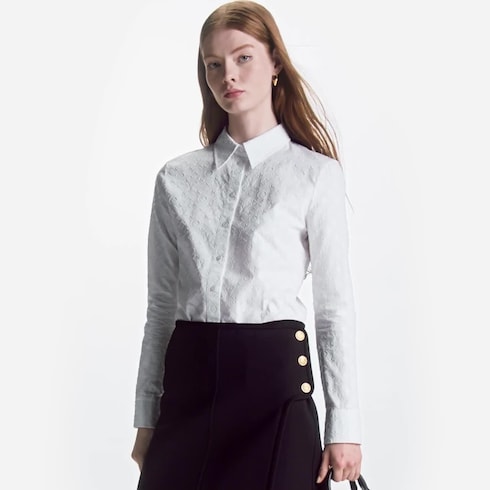 Esta camisa ajustada de manga larga se caracteriza por su forma distintiva, que la convierte en un básico femenino actual. Está confeccionada en popelín de algodón suave realzado con un elegante motivo Monogram integral en fil coupé. La etiqueta decorativa Monogram Flower de la manga añade un toque emblemático a la pieza.