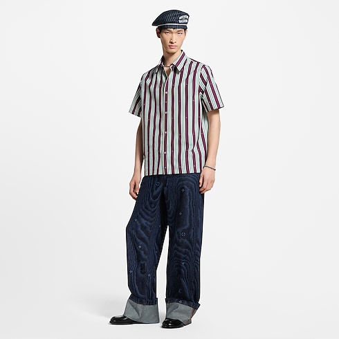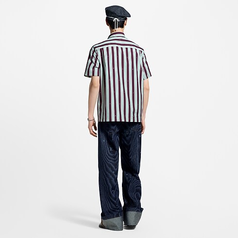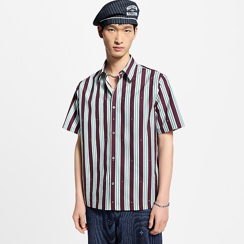 Esta vaporosa camisa de manga corta, inspirada en la estética de los cruceros de esta colección, luce un motivo LV Boat Stripes en rojo burdeos y azul pálido, combinado con discretos detalles Monogram. Confeccionada en brillante mezcla de algodón y seda, incorpora botones nacarados con base metálica dorada. Esta prenda veraniega brinda un refinado toque gráfico a cualquier look.