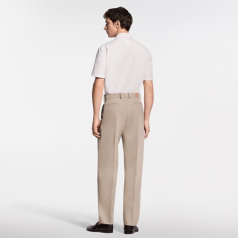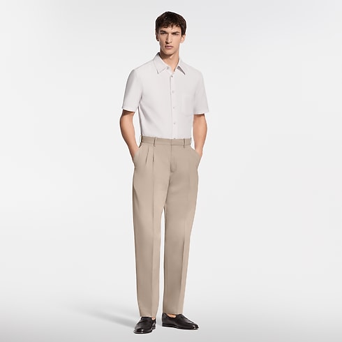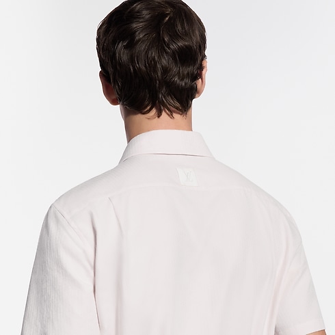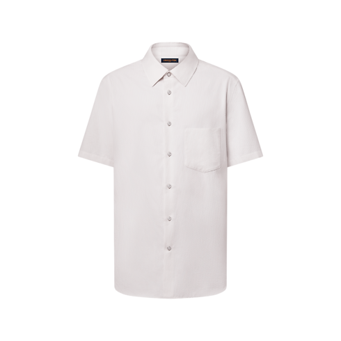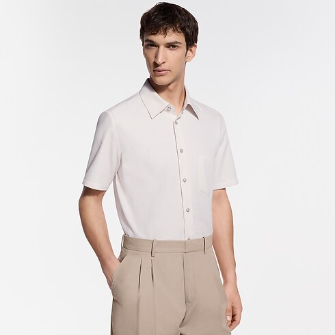 Esta camisa de manga corta en tono blanco marfil es una opción fresca para los días más cálidos. Está confeccionada en fino algodón orgánico adornado con un motivo LV Interlocked en Jacquard. Incluye un botón LV en el cuello y etiquetas distintivas tejidas en la tapeta de botones y la parte trasera. La prenda puede combinarse con el traje con el mismo motivo.