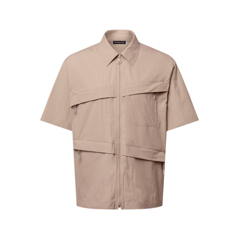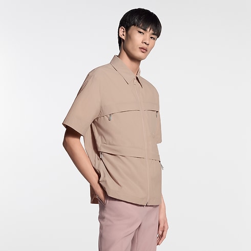 Esta camisa de manga corta con cremallera, confeccionada en un ligero tejido técnico de un atemporal tono marrón camel, está inspirada en la elegante temática alpinista vista en el desfile Primavera-Verano 2026. Presenta un diseño contemporáneo, con cuatro bolsillos con cremallera dispuestos de forma asimétrica y tiradores deportivos, y muestra un motivo distintivo bordado tono sobre tono en el bolsillo del pecho. Esta prenda puede lucirse como una camisa clásica o llevarse abierta sobre una camiseta.