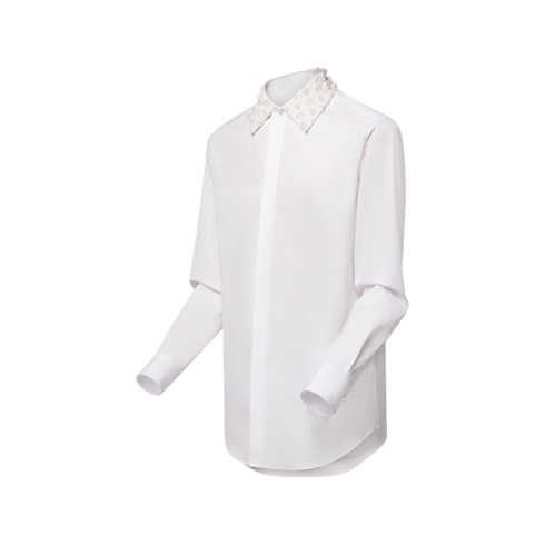 Esta elegante camisa de traje, confeccionada en algodón orgánico certificado, destaca por el cuello bordado con cuentas nacaradas de diferentes tamaños, que crean un exquisito efecto Damier tridimensional tono sobre tono. Presenta una refinada tapeta con un botón superior que imita una perla y un cierre oculto, como los clásicos modelos de esmoquin. La prenda aportará un toque distintivo a cualquier conjunto formal.