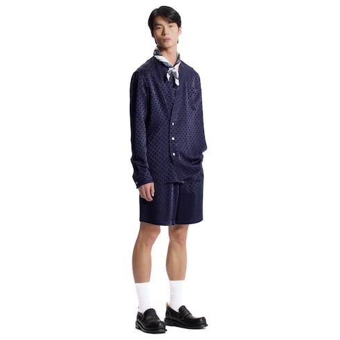 Esta camisa fluida de manga larga destaca por un moderno diseño tipo kimono inspirado en los orígenes japoneses de Nigo, que ha colaborado con Pharrell Willilams en la Colección Otoño-Invierno 2025. Confeccionada en sedoso tejido Jacquard de color azul marino intenso, luce un motivo Dandy Monogram tono sobre tono y delicados botones con efecto nacarado. Esta elegante pieza se completa con un parche con la inscripción «Marque L.Vuitton Déposée» en la parte trasera.