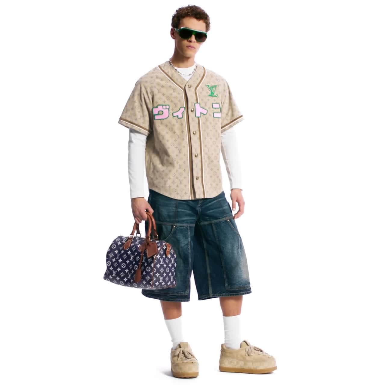 Esta camisa tipo béisbol, perteneciente a la colaboración entre Pharrell y Nigo para el desfile Otoño-Invierno 2025, es un modelo moderno y veraniego que demuestra la maestría artesanal de la Maison. Confeccionada en piel de becerro flexible de color beige, se distingue por un efecto lino y un delicado estampado Monogram. Se completa con parches distintivos en piel rosa y verde: un motivo LV Japan en el pecho y un logotipo Vuitton en la parte trasera.
