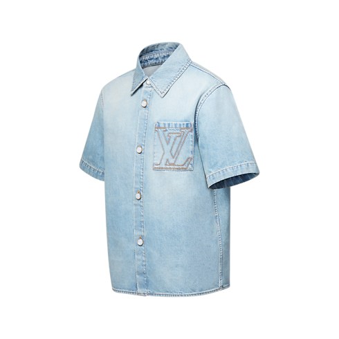 Esta imprescindible camisa vaquera de manga corta, confeccionada en tejido denim japonés de gran calidad, refleja la maestría de Louis Vuitton. Incorpora pespuntes de color marrón tabaco, botones con efecto perlado y dos logotipos LV, uno bordado en el bolsillo del pecho y otro en el parche de piel nobuk de la parte trasera. Esta cómoda prenda es muy fácil de combinar con cualquier look de diario.