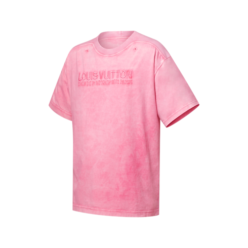 Esta camiseta destaca por su diseño rosa deslavado teñido en prenda, que le confiere un aire informal y vintage. Presenta inserciones en tejido acanalado que se extienden desde el cuello hasta las mangas, y añaden un toque moderno. Se completa con un distintivo Louis Vuitton tono sobre tono bordado en el pecho y ojales de flor Monogram bordados en el cuello.