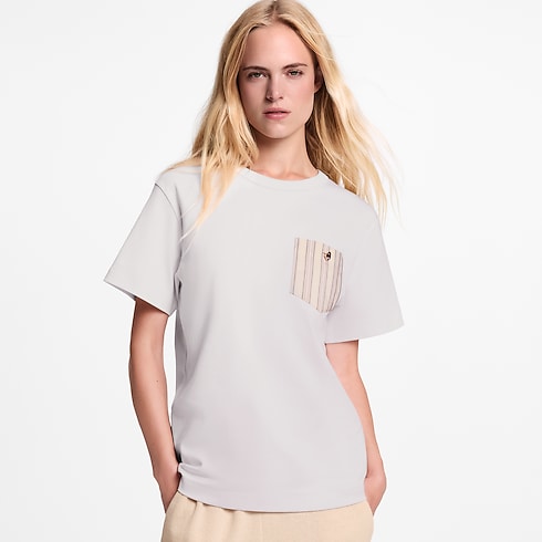 Esta camiseta, de corte recto y cuello redondo acanalado, es una prenda imprescindible y atemporal confeccionada en suave punto de algodón. Luce un bolsillo de parche con un alegre motivo de rayas de colores en el pecho, y un brillante botón tipo joya, que aporta un toque alegre y refinado.