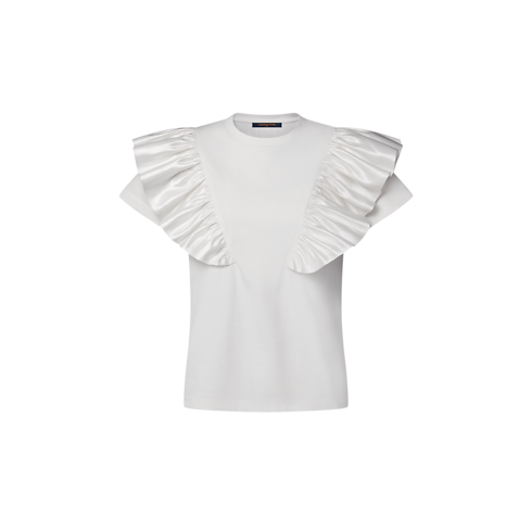 Esta camiseta de estética escultural, vista en la pasarela, luce dos ribetes de volantes de satén brillante, que aportan un romántico toque de volumen a los hombros. La pieza, elaborada en punto de algodón transpirable, presenta un corte recto atemporal y muy versátil. Se completa con un parche Louis Vuitton Paris en piel tono sobre tono, que añade una sutil nota distintiva a la parte trasera.