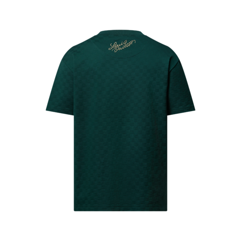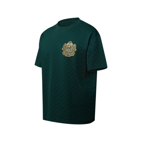 Esta camiseta de estilo regio en intensos tonos verdes está inspirada en las exhibiciones caninas de Westminster. Confeccionada en piqué de algodón orgánico, luce un patrón Damier realizado en Jacquard con efecto texturizado y motivos distintivos de color dorado bordados, como el blasón LV Dog en el pecho. La pieza, perfecta para las celebraciones de fin de año, presenta una silueta informal y elegante.