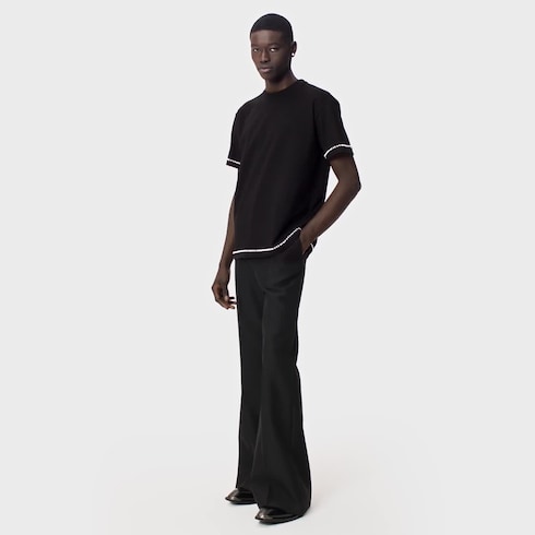 Esta camiseta negra, elegante e informal, está confeccionada en algodón. Este diseño clásico presenta tachuelas con efecto nacarado en las mangas y el bajo, que le aportan un refinado estilo dandi. Se completa con una inscripción «Marque L.Vuitton déposée» bordada en relieve con hilo brillante sobre el pecho, que le aporta un exquisito toque distintivo.