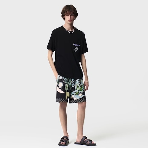 Esta elegante camiseta de manga corta en color negro se realza con un motivo bordado con cuentas en tonos azul a contraste. Presenta un bolsillo de parche en el pecho con un ribete Damier en la parte superior y la inscripción «Marque L.Vuitton Déposée». Esta prenda de cuello redondo es ideal para brindar un toque distintivo a cualquier look informal.