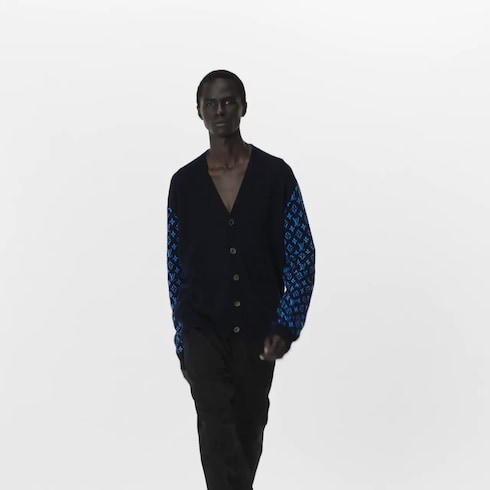 Esta elegante rebeca informal, confeccionada en suntuosa mezcla de cachemir, incorpora botones jaspeados, bolsillos de parche y hombros caídos. Luce un motivo integral Monogram realizado en Jacquard en las mangas de un llamativo tono azul a contraste, que añade un toque gráfico al diseño. Esta versátil prenda de entretiempo combina a la perfección con looks formales y casuales.