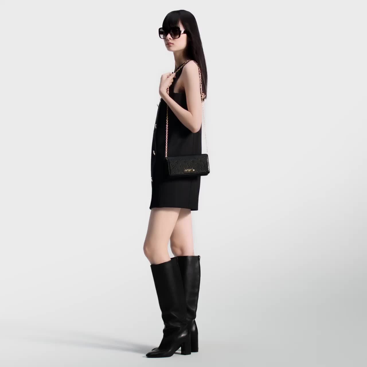Esta cartera Lily, confeccionada en piel Monogram Empreinte flexible y granulada, presenta un diseño compacto con solapa. Esta pieza, ideal para guardar los esenciales de día o de noche, luce una elegante forma rectangular con un sutil aire retro. Se completa con piezas metálicas de color dorado, como una placa con un distintivo Louis Vuitton grabado y una cadena ajustable y extraíble con un colgante LV Circle.