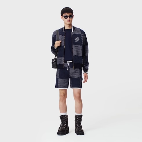 Esta exquisita cazadora bomber, confeccionada en punto de algodón ligeramente acolchado en tonos azul marino, presenta un refinado motivo Damier grande realizado en Jacquard y una inscripción «Marque L.Vuitton déposée» en el lado izquierdo del pecho. Luce una elegante raya blanca que decora el cuello y los puños acanalados. Esta prenda veraniega, ideal para viajar, puede combinarse con el pantalón corto a juego.