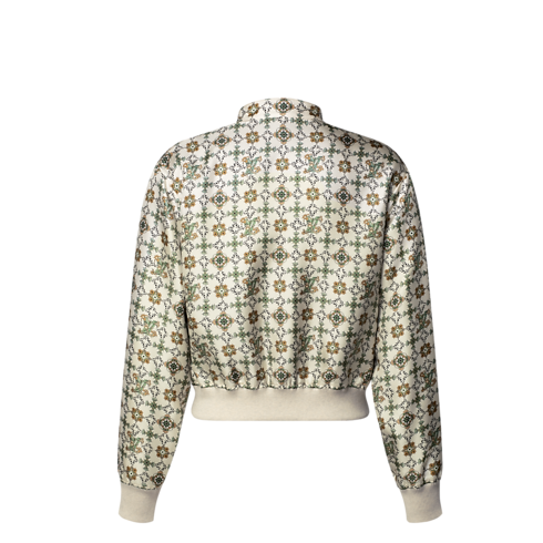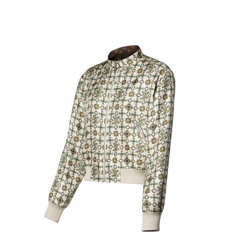 Esta cazadora bomber reversible, confeccionada en suave sarga de seda, incorpora un cierre de cremallera y un cuello con botón a presión que brindan un acabado contemporáneo. El anverso rinde homenaje al estilo art nouveau de la Maison con un elegante estampado floral, sutilmente realzado por distintivos Louis Vuitton. El reverso, por su parte, presenta un clásico motivo Monogram realizado en Jacquard con detalles de lana a contraste.
