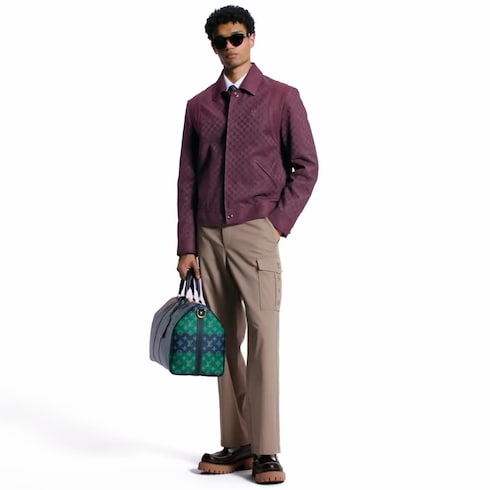 Esta distinguida cazadora, confeccionada en piel de otoñales tonos burdeos, luce un motivo integral Mini Damier en relieve con inscripciones «Marque L.Vuitton Déposée». Presenta inserciones tono sobre tono alrededor de los hombros, inspiradas en la temática deportiva de esta colección. Se completa con un adorno LV en metal esmaltado en el pecho y detalles Monogram realizados en Jacquard en la parte trasera de la cintura acanalada.