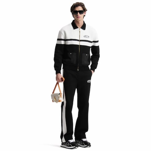 Esta cazadora híbrida con cremallera, confeccionada en punto de algodón negro, es ideal para viajar. Presenta inserciones de piqué texturizado y punto gofrado de color blanco a contraste, así como un logotipo L.Vuitton bordado en el pecho. Esta prenda técnica de estilo deportivo puede combinarse con el pantalón a juego para crear un conjunto refinado.