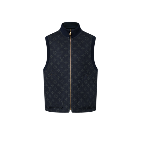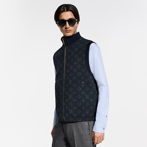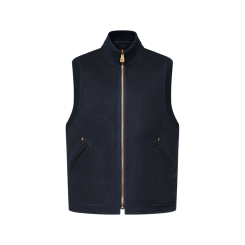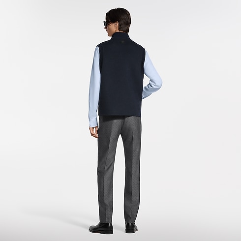 Este chaleco reversible de color azul marino está confeccionado en un cálido y lujoso tejido de doble cara en mezcla de lana, cachemir y seda. Presenta un lado liso clásico adornado con discretos cristales en el pecho, remaches LV Flower en los bolsillos y un parche en piel en la parte trasera, así como un lado gráfico con un motivo Monogram tonal en Jacquard. Esta prenda, ideal para entretiempo, puede llevarse sobre una camisa o un jersey, o debajo de una chaqueta.