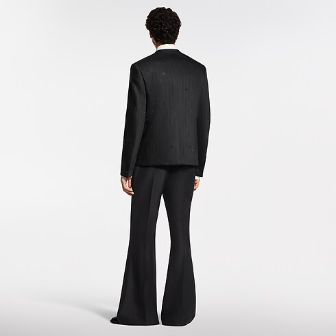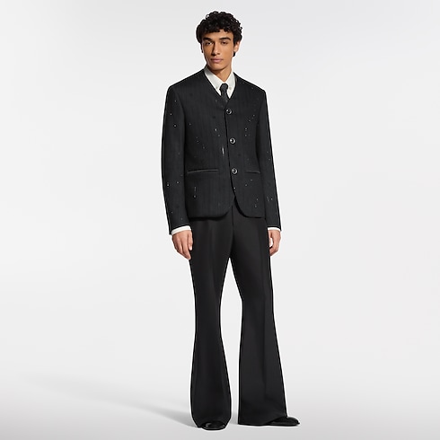 Esta distintiva chaqueta negra de noche se inspira en la icónica prenda sin cuello presentada por Pharrell Williams. Su silueta minimalista, con escote de pico y bolsillos de satén ribeteados, está adornada con deslumbrantes gemas que crean un motivo de raya diplomática, junto con elementos Monogram. Los gemelos LV y los botones distintivos aportan una nota tipo joya. Ese modelo con profusión de detalles brindará un acabado exquisito a un look de noche.