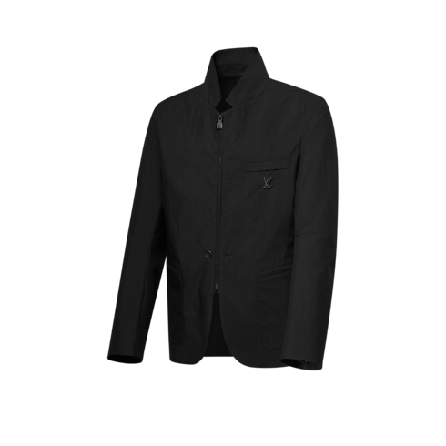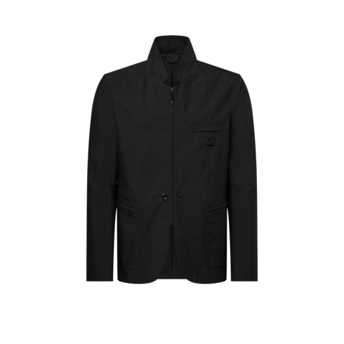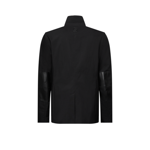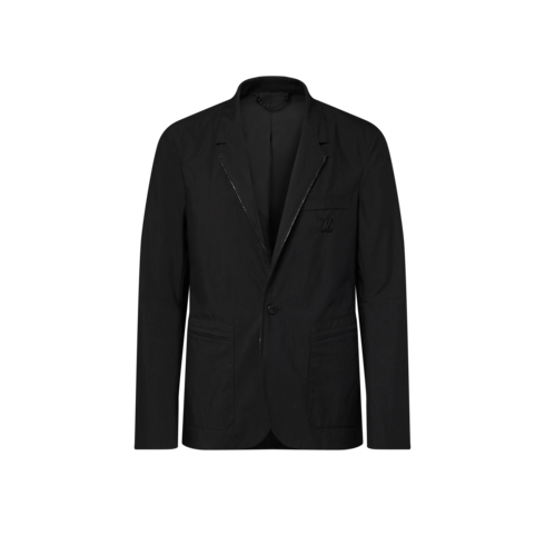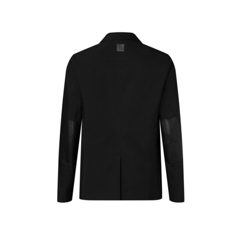 Esta chaqueta negra de botonadura sencilla presenta una silueta elegante reinterpretada con detalles utilitarios. Esta prenda sin forro, confeccionada en tejido técnico ripstop de algodón, incorpora una solapa con cremallera en los bordes y coderas en piel negra. Incluye un bolsillo en el pecho con un adorno LV, y un parche trasero en piel negra con la inscripción «Marque L.Vuitton Déposée». Puede combinarse con los pantalones cargo a juego para crear un look urbano monocromo.