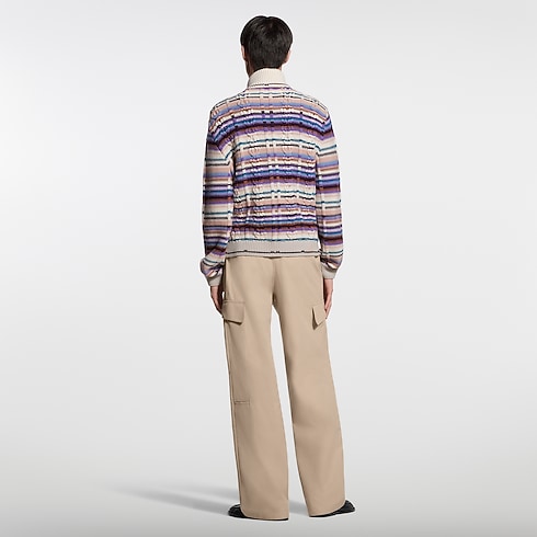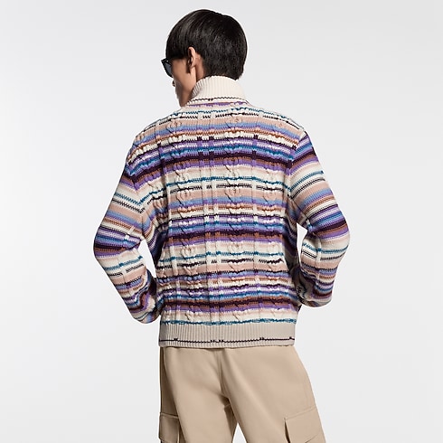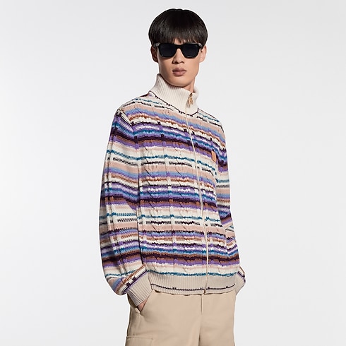 Esta exquisita chaqueta de chándal en lana y cachemir, de aspecto artesanal, luce rayas de colores integradas en el diseño de punto de ochos texturizado. Incluye de cierre de cremallera y un cuello alto, por lo que puede llevarse como rebeca o como prenda exterior ligera en los días cálidos de primavera. Un parche distintivo en piel aporta un toque emblemático y refinado al pecho.