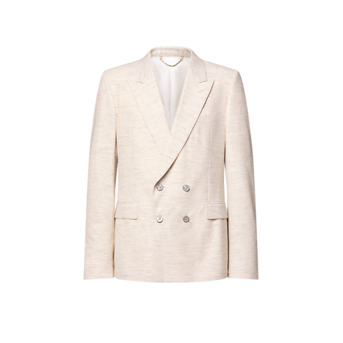 Esta exquisita chaqueta de doble botonadura presenta un diseño inspirado en las exquisitas texturas y tonalidades de influencia hindú del desfile Primavera-Verano 2026. Esta prenda de silueta definida está confeccionada en lana y algodón de un delicado tono beige, y luce un diseño sutilmente texturizado y moteado que evoca los hilos teñidos con pigmentos naturales de la India. Un parche distintivo en piel realza la manga izquierda. Puede conjuntarse con el pantalón acampanado a juego para crear un traje elegante para la primavera.