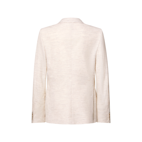 Esta exquisita chaqueta de doble botonadura presenta un diseño inspirado en las exquisitas texturas y tonalidades de influencia hindú del desfile Primavera-Verano 2026. Esta prenda de silueta definida está confeccionada en lana y algodón de un delicado tono beige, y luce un diseño sutilmente texturizado y moteado que evoca los hilos teñidos con pigmentos naturales de la India. Un parche distintivo en piel realza la manga izquierda. Puede conjuntarse con el pantalón acampanado a juego para crear un traje elegante para la primavera.