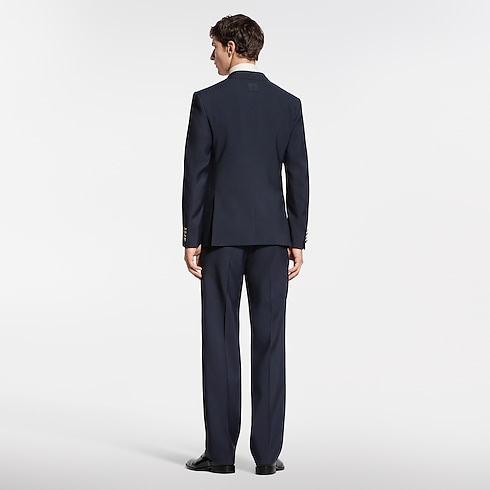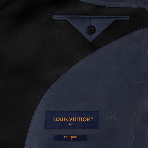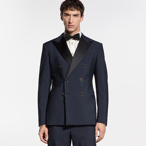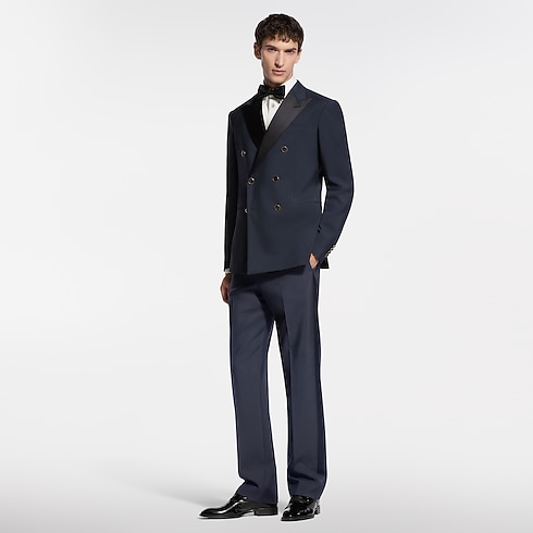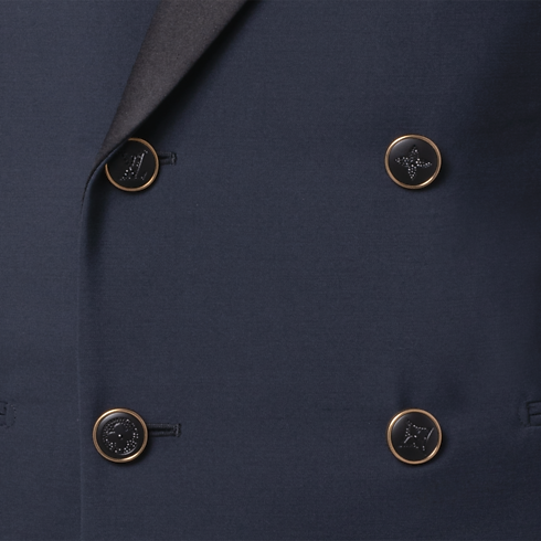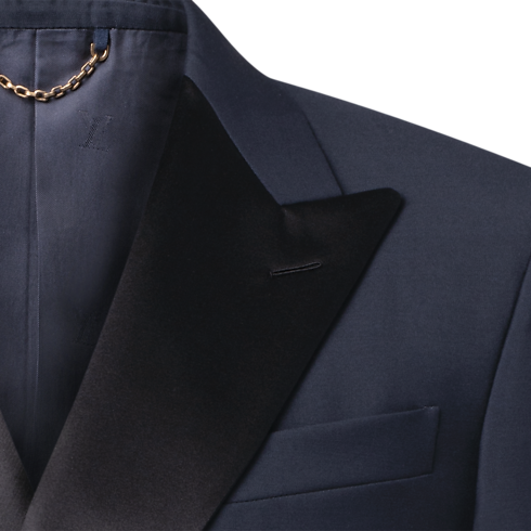 Esta impecable chaqueta de esmoquin, confeccionada en elegante lana grain de poudre de color azul marino, presenta solapas de pico en satén negro. La parte delantera se realza con botones distintivos con gemas y base metálica dorada, mientras que la parte trasera se adorna con una discreta etiqueta LV de tela. La prenda puede combinarse con el pantalón a juego para crear un conjunto de noche refinado y atemporal.