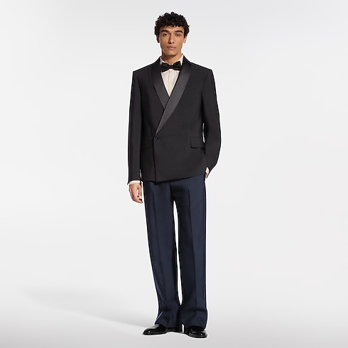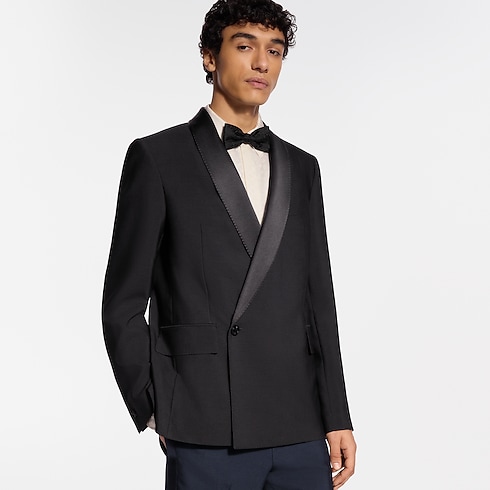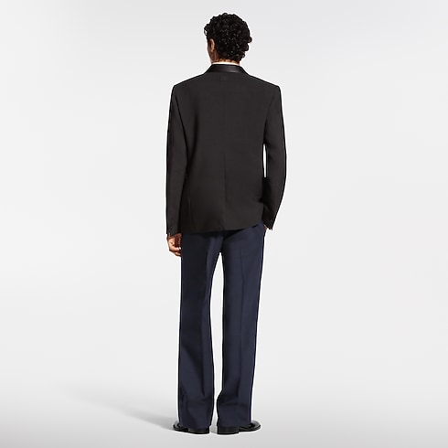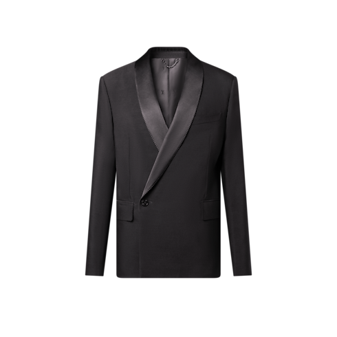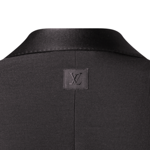 Esta elegante chaqueta de esmoquin, de líneas minimalistas, está confeccionada en crepé de lana y seda negra. Cuenta con una solapa redondeada de satén, un botón tipo joya distintivo y puntadas a mano, que aportan un detalle clásico de sastrería. Se completa con una etiqueta LV de tela en la parte trasera y un forro LV Blason. Puede combinarse con el pantalón a juego para crear un traje refinado.