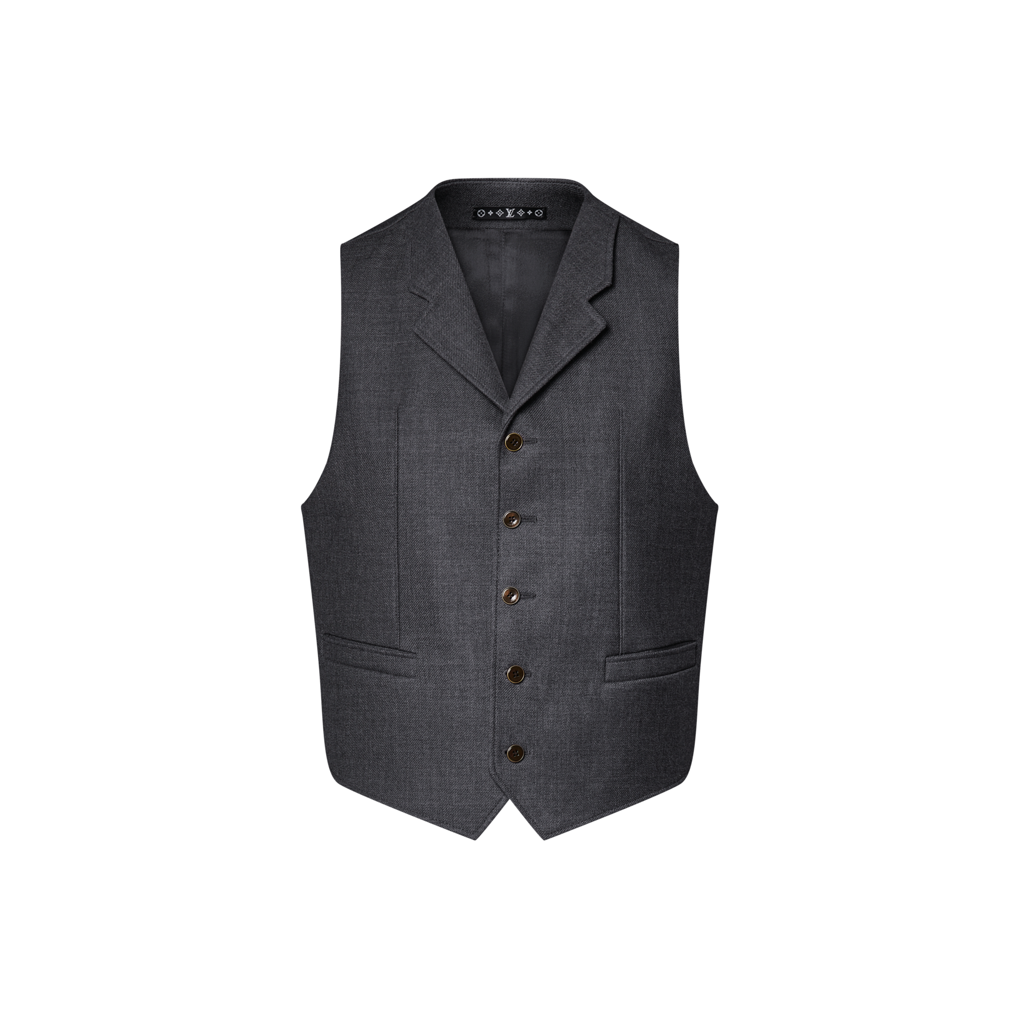 Esta elegante chaqueta de botonadura sencilla, inspirada en los clásicos trajes británicos, está confeccionada en exquisita sarga de lana de un atemporal gris oscuro. Presenta un refinado broche extraíble tipo joya y discretos detalles de estilo utilitario, como una solapa de muesca alta y una tapeta de botones oculta, que aportan un matiz contemporáneo. Esta prenda puede combinarse con el chaleco y el pantalón a juego para crear un distinguido traje de tres piezas.