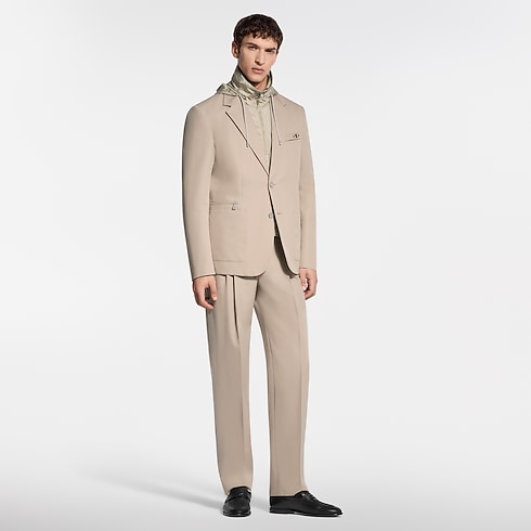 Esta chaqueta 3 en 1 de botonadura sencilla, confeccionada en sarga de lana y algodón repelente al agua, incluye un chaleco técnico extraíble con capucha plegable. Luce un bolsillo en el pecho con cremallera y un logotipo LV metálico, además de un práctico bolsillo con cremallera. De un elegante tono beige atemporal, esta prenda puede combinarse con el pantalón a juego para crear un look de negocios contemporáneo.