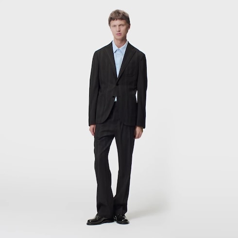 Esta cómoda y liviana chaqueta sin forro se inspira en la sastrería italiana. Este modelo ligeramente estructurado de lana tonal presenta un motivo integral Monogram Stripes realizado en Jacquard, que incorpora discretos logotipos LV y flores Monogram. Se puede combinar con el pantalón con cordón a juego para crear un look elegante, informal y favorecedor gracias al patrón de rayas verticales.