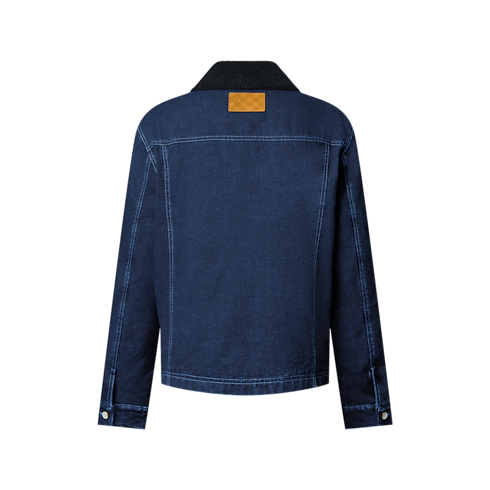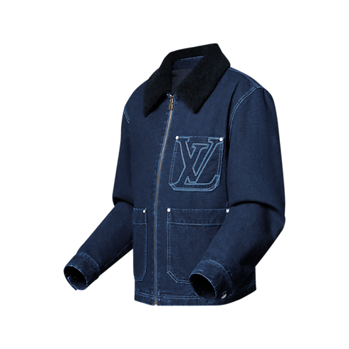Esta chaqueta vaquera de estilo utilitario, confeccionada en lujosa lona de tejido denim japonés, es perfecta para looks de diario. Presenta un cálido cuello de lana de oveja, un forro Monogram acolchado, un logotipo LV bordado en el bolsillo del pecho y un parche LV en ante en la parte trasera. La prenda, que cuenta con un pantalón a juego, se completa con remaches y botones con efecto nacarado que aportan un toque dandi.