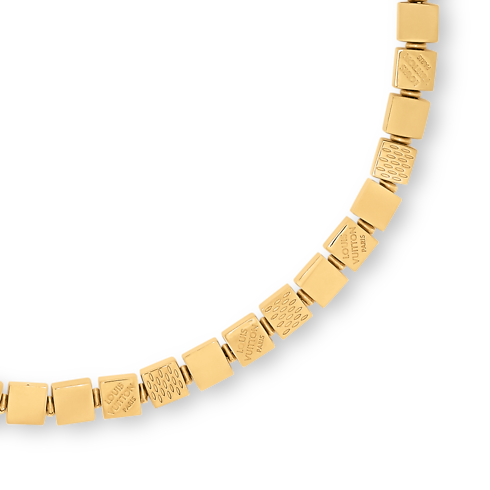 El collar LV Cube es un diseño alegre y elegante inspirado en dos iconos de la historia de la Maison: el clásico motivo Damier y el Pateki, un juego de ingenio inventado por Gaston Vuitton en 1932. Consta de varios cubos de metal de color dorado enlazados y finamente grabados con el logotipo Louis Vuitton Paris y rayas que evocan la lona Damier. Esta pieza, llamativa y refinada, es perfecta tanto para el día a día como para ocasiones especiales.