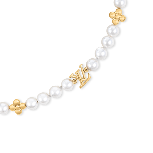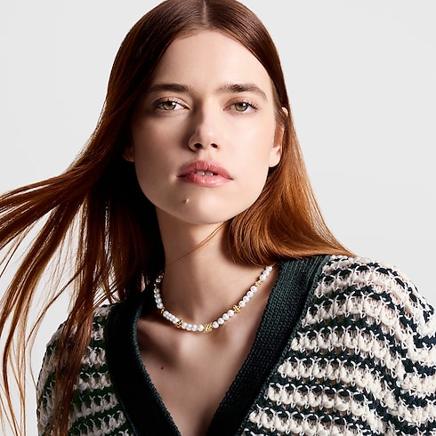 El refinado y elegante collar My LV Pearl refleja el espíritu de las gloriosas noches de verano. Los emblemáticos logotipos LV Initials y las flores Monogram de la Maison, elaborados en brillante metal de color dorado, se alternan con relucientes perlas de resina blanca, que evocan la inmaculada pureza de una playa de arena fina. Esta pieza femenina y atemporal aportará un discreto toque distintivo.