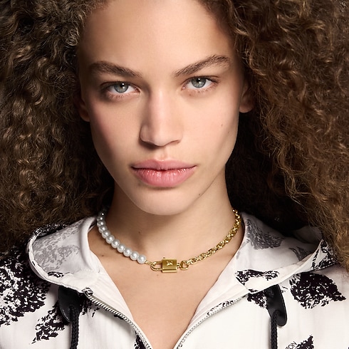 El collar Pearlock combina un elemento icónico de la Maison con la belleza atemporal de la perla. Su diseño dos en uno presenta una cadena metálica de color dorado y una hilera de delicadas perlas de resina blanca, unidas por dos emblemáticos candados LV con llaves. Esta joya, elegante y versátil, puede lucirse como gargantilla o transformarse en dos pulseras a contraste.