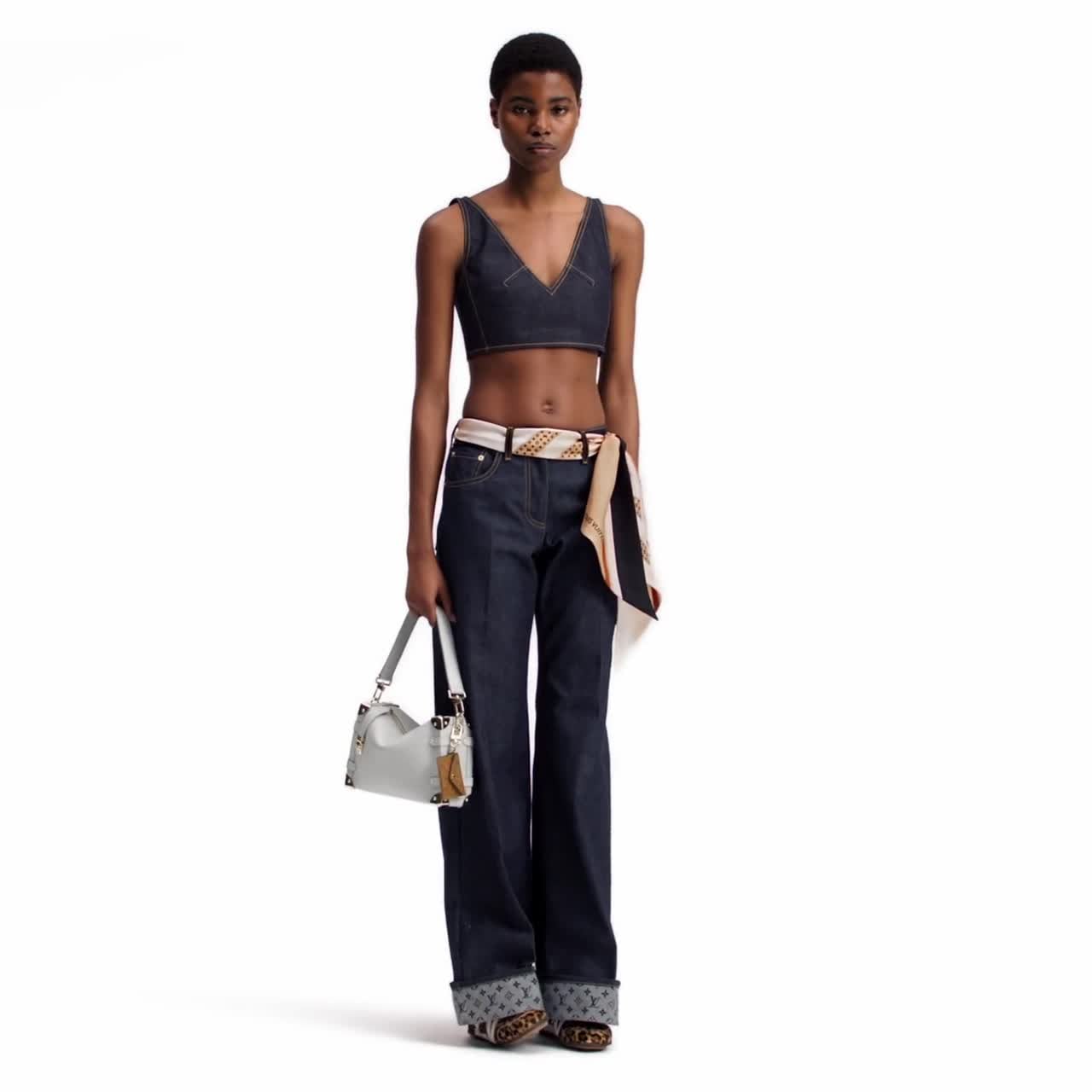 Este crop top, confeccionado en el tejido denim oscuro con efecto lavado de la temporada, luce puntadas de color amarillo a contraste, que le confieren una estética atemporal. Esta refinada prenda presenta un corte estructurado y ajustado con un marcado cuello de pico, que se reproduce en la parte trasera. El tirador con flecos de lona Monogram que decora la cremallera brinda un toque moderno.