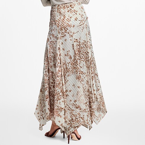 Esta falda elegante y versátil, confeccionada en seda vaporosa, presenta un sutil motivo de rayas realizado en Jacquard superpuesto con motivos florales. Esta prenda de largo completo y silueta voluminosa luce un bajo tipo pañuelo que realza la fluidez del tejido. Se completa con una cremallera invisible.