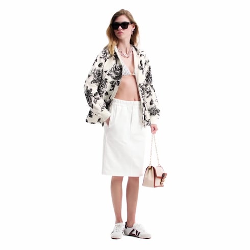 Esta falda luce un original diseño de inspiración masculina con cintura elástica, dos pequeños botones y una bragueta decorativa. La versátil prenda, confeccionada en punto de algodón, presenta un corte midi minimalista. Se completa con un bolsillo en tejido denim tono sobre tono con un motivo Monogram en relieve en la parte trasera, que incluye una placa dorada con el distintivo Louis Vuitton.