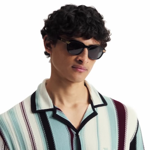 Las gafas de sol LV Slide Square Round destacan por su exquisito diseño artesanal y sus refinados detalles. Este modelo presenta una montura de acetato brillante con una silueta angular y curva a la vez. Las cuatro bandas de metal dorado, que se extienden desde el lateral del frontal hasta la mitad de las patillas y culminan en un logotipo LV, añaden un efecto misterioso.