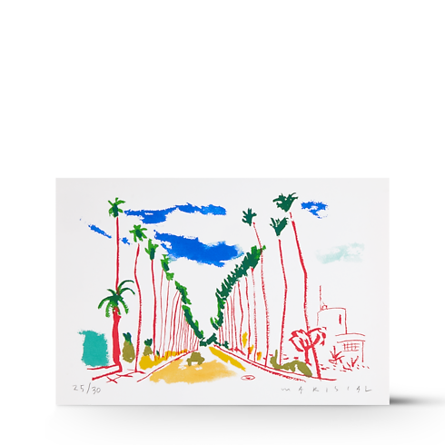 El artista español Javier Mariscal le tiene cariño a California, cuyos despejados cielos azules y brillante luz blanca le recuerdan a su Valencia natal. Durante su quinto viaje a Los Ángeles, mantuvo una actitud curiosa y abierta, bocetando de forma espontánea figuras, objetos y paisajes en su cuaderno o su iPad. Lo que más le atrae de la ciudad son, sin embargo, la luces de neón, los eslóganes, los rótulos de las tiendas, las vallas publicitarias y los logotipos que inundan sus calles. El artista da vida a su vibrante universo visual con una gran cantidad de sorprendentes tipografías. Javier Mariscal es diseñador gráfico, ilustrador, diseñador, cineasta, pintor, escultor y ceramista, un artista completo que disfruta de la libertad creativa. A mediados de los 70, publicó su primer cómic y se hizo famoso con el logotipo BAR CEL ONA, creado en 1979, junto con el diseño del taburete Dúplex, que dio lugar a su participación en la emblemática exhibición de Ettore Sottsass y el grupo Memphis en Milán en 1981. Uno de sus diseños más célebres es Cobi, la mascota de los Juegos Olímpicos de Barcelona de 1992. También ha diseñado portadas para The New Yorker y carteles para Pedro Almodóvar, además de dirigir junto a Fernando Trueba una película de animación nominada a los Óscars en 2012. La colección de guías de viaje de Louis Vuitton es una invitación para embarcarse en itinerarios reales y virtuales. En sus páginas, las ilustraciones de renombrados artistas y prometedores jóvenes talentos cuentan las historias de ciudades y países que han visitado. Los mundos creativos que se muestran son extremadamente diversos: durante sus viajes, estos artistas, originarios de distintos puntos del planeta, tuvieron la libertad de elegir su propio modo de expresión: desde pintura e ilustración hasta collage y manga. La guía de viaje de Los Ángeles es una edición limitada de 30 ejemplares numerados y firmados por el artista. Este volumen de gran formato, encuadernado en piel, incluye una serigrafía de Javier Mariscal.