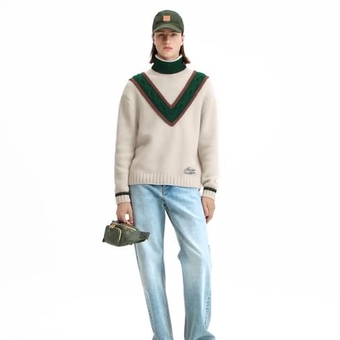 Este refinado jersey universitario está inspirado en los códigos sartoriales de la campiña británica. Está confeccionado en lana de punto grueso con un tono beige claro y luce un motivo tridimensional de ochos en color verde a contraste, que forma una vistosa V sobre el pecho. La misma tonalidad se reproduce en el cuello cisne, los puños deportivos de punto elástico y el elegante distintivo bordado sobre la parte izquierda del bajo.