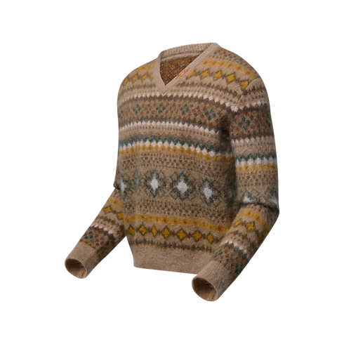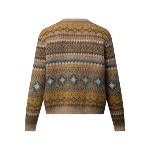 Este jersey mullido, elaborado en mezcla de lana y mohair, rinde homenaje a la estética sartorial británica. Presenta un refinado motivo integral LV Fair Isle realizado en Jacquard en tonalidades marrones, que incorpora unos discretos detalles distintivos de la Maison. Este cálido modelo, inspirado en los paseadores de perros de Westminster de la colección, incluye un cuello de pico acanalado con un distintivo Louis Vuitton bordado.