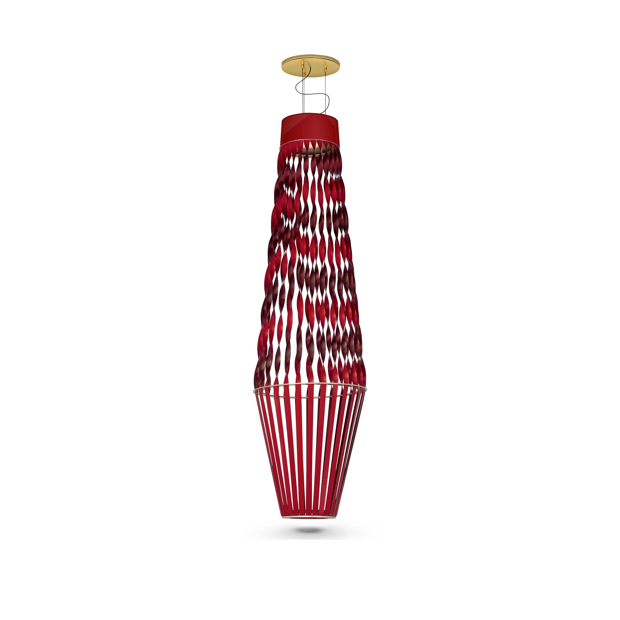 La lámpara Spiral, del estudio de arquitectura y diseño Atelier Oï para la colección Objets Nomades de Louis Vuitton, no es solo un accesorio de iluminación: constituye un juego infinito de luces y sombras. Las treinta y dos tiras de piel en espiral, con acabado natural por una cara y metálico en la otra, reflejan y dirigen la luz de dos bombillas LED. El aro central móvil facilita el cambio de configuración a fin de multiplicar las posibilidades de interacción con el resto de la decoración.
