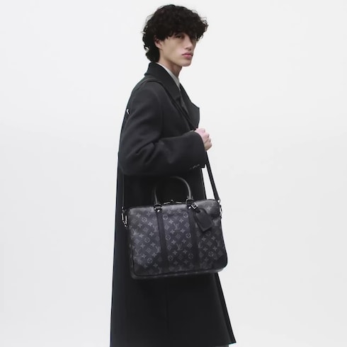 Este maletín Porte-Documents Voyage PM, confeccionado en lona Monogram Eclipse, es un modelo de líneas depuradas en atemporales tonos negros y grises. Las asas superiores en piel de color negro, las bandas laterales y las esquinas reforzadas aportan estructura al diseño. Incluye una bandolera ajustable y extraíble que permite llevarlo de diferentes maneras.