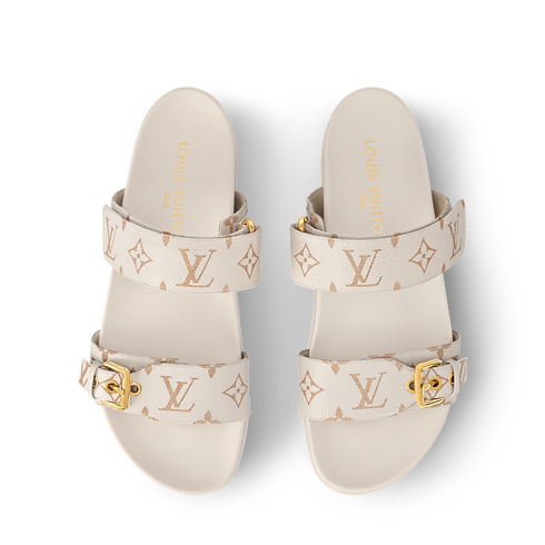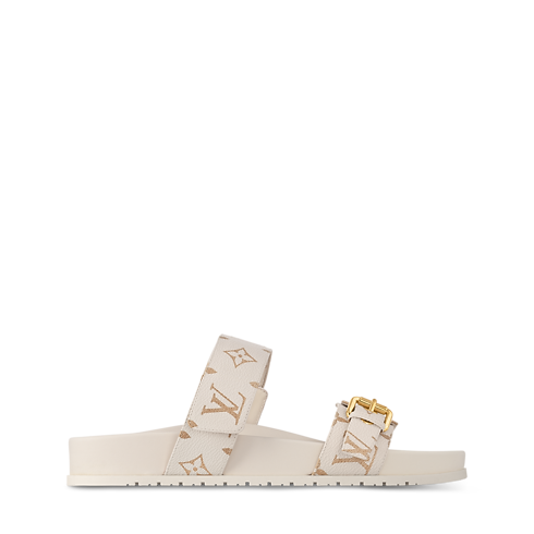 Este mule plano Bom Dia Comfort se ha confeccionado en lona Monogram, que le confiere un sutil toque distintivo. Incorpora dos tiras ajustables: una con un cierre de velcro y otra con una hebilla de color dorado. Esta refinada pieza cuenta con una plantilla anatómica acolchada y una ligera suela de goma, ambas a juego con el empeine.