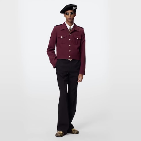 Este imprescindible pantalón de traje negro, presentado en el desfile Primavera-Verano 2024, está confeccionado en sarga de lana. La versátil prenda presenta un elegante corte acampanado. Se puede combinar con la chaqueta de doble botonadura a juego para crear un refinado conjunto de traje.