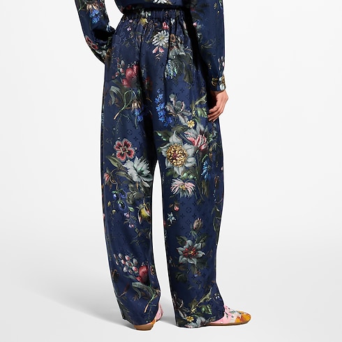 Este elegante y vistoso pantalón tipo pijama, visto en el desfile, se ha confeccionado en sarga de seda vaporosa. Luce un brillante motivo Monogram en Jacquard en intensos tonos azul marino y un refinado estampado floral superpuesto. Este modelo holgado de corte recto incluye una cintura con cordón, que le confiere un toque informal y atemporal.