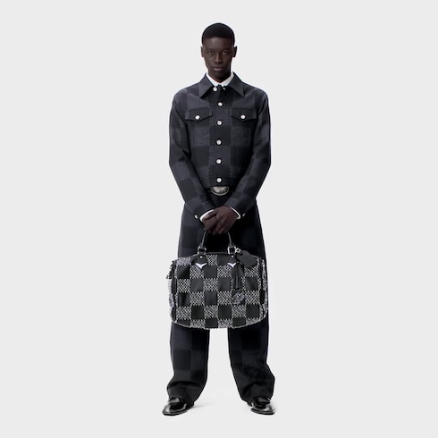 Este cómodo y refinado pantalón, confeccionado en refinada lana, presenta una clásica silueta denim de cinco bolsillos. Luce un delicado motivo Damier realizado en Jacquard en elegantes tonos azul marino con inscripciones «Marque L.Vuitton déposée» integradas. La pieza, que cuenta con una chaqueta a juego, se completa con un botón y tachuelas con efecto nacarado.