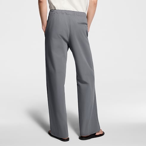 Este pantalón con cordón de color gris claro, confeccionado en ligero crepé de satén de mezcla de lana, es una prenda elegante ideal para looks formales e informales. Su diseño drapeado incorpora una cómoda cintura elástica y pliegues en la parte delantera, mientras un distintivo Louis Vuitton impreso en silicona de estilo deportivo brinda un toque moderno a la pernera izquierda. Esta prenda primaveral aporta un exquisito contraste a los motivos florales de la colección.