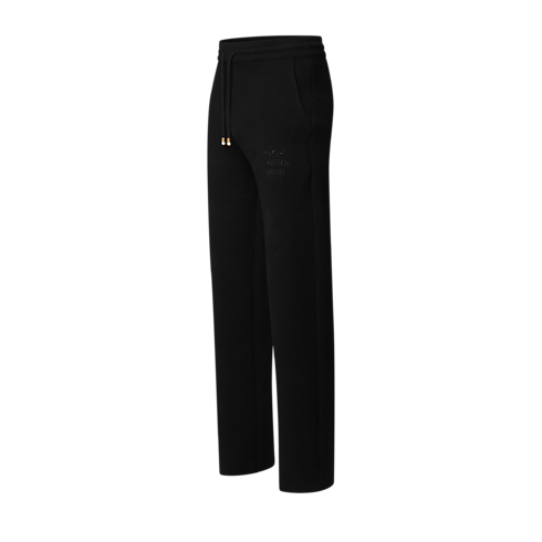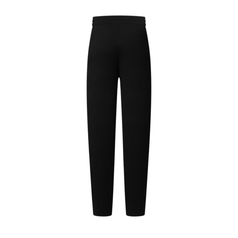 Este pantalón negro, elaborado en mezcla de lana, es una versión refinada del clásico modelo informal de chándal. Se caracteriza por el motivo integral Damier Argyle de la colección, que se presenta en punto monocromático con un efecto tridimensional acolchado. Esta pieza, que combina con una elegante cazadora, incluye una inscripción «Marque L.Vuitton deposée» bordada en la pernera izquierda y un cómodo cordón con extremos nacarados en la cintura.